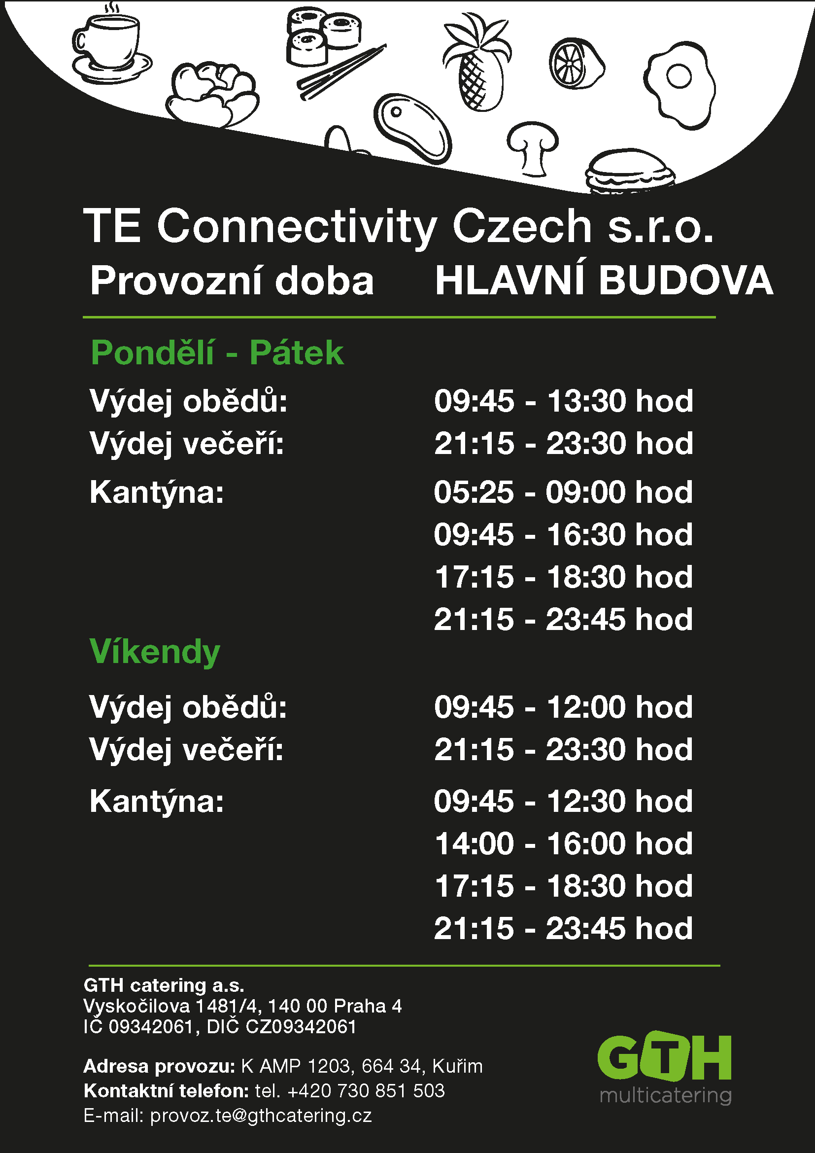 Informace a novinky Jak objednat jídlo Postup při reklamaci jídel Kontaktní informace Provozní doba Kniha námětů Denní hodnocení Anketa vyhodnocení 9-2025 Jídelní lístek Smart zóna 20.10. - 26.10.2025 Jídelní lístek hl. budova 20.10. - 26.10.2025 Jídelní lístek hl. budova 27.10. - 2.11.2025 Jídelní lístek Smart zóna 27.10. - 2.11.2025 TE Connectivity Czech s.r.o. Provozní doba